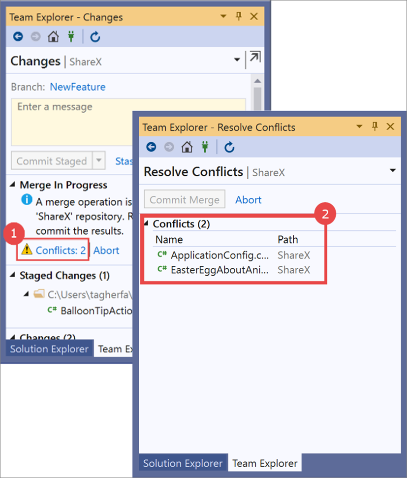 Access list of files with conflicts Screenshot collage of the Changes window and the Resolve Conflicts window for Team Explorer in Visual Studio 2019, with a procedure overlay.