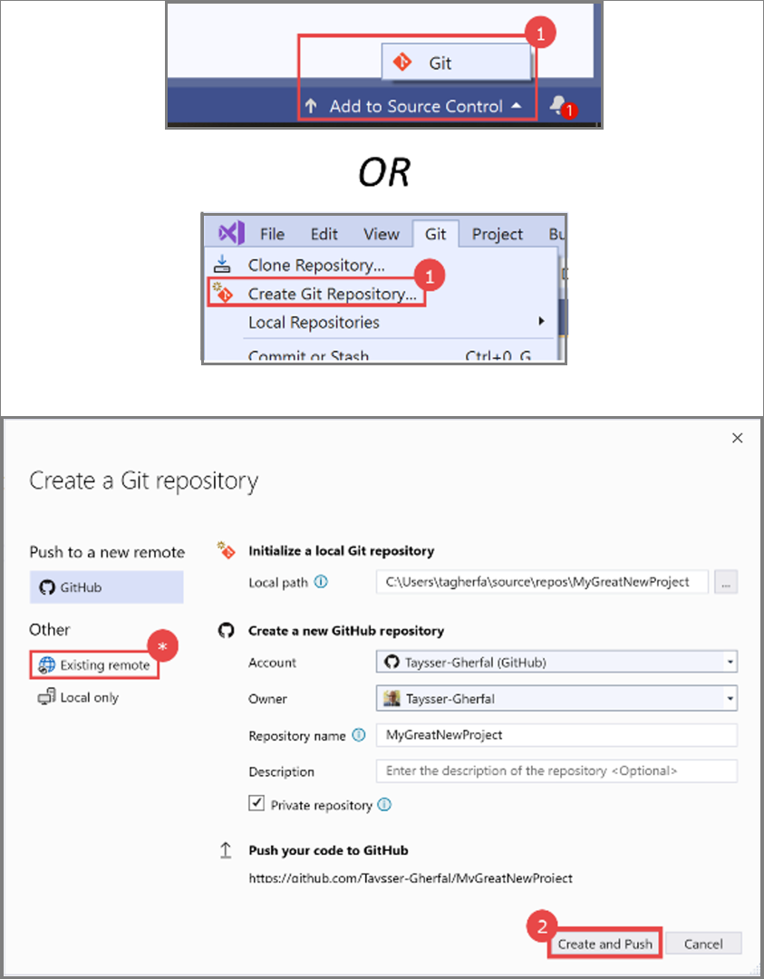 Note: Use the existing remote option if you want to add your code to Azure DevOps. In this case, you must create an Azure DevOps repository first.