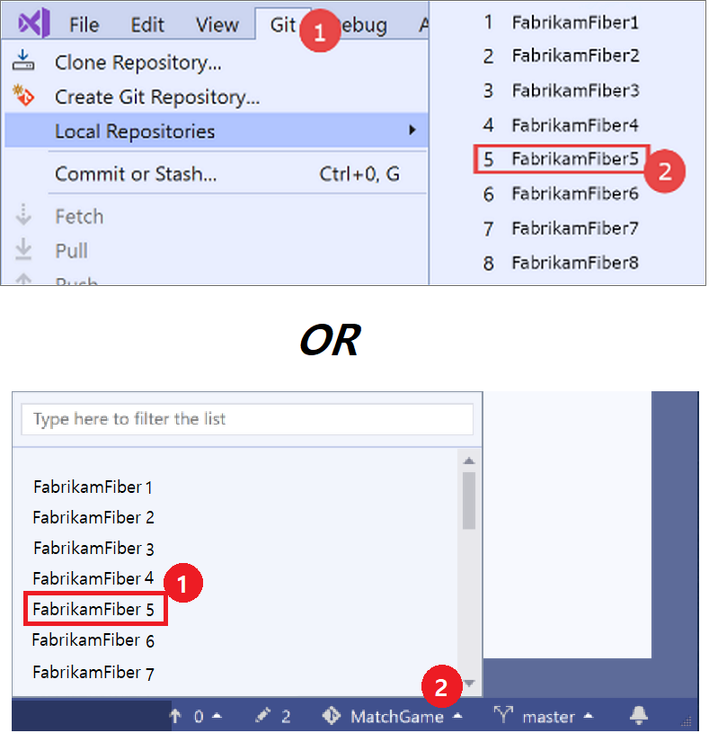Switch between repos Screenshot of the Connect window for Team Explorer in Visual Studio 2019, with a 'switch between repos' procedure overlay.