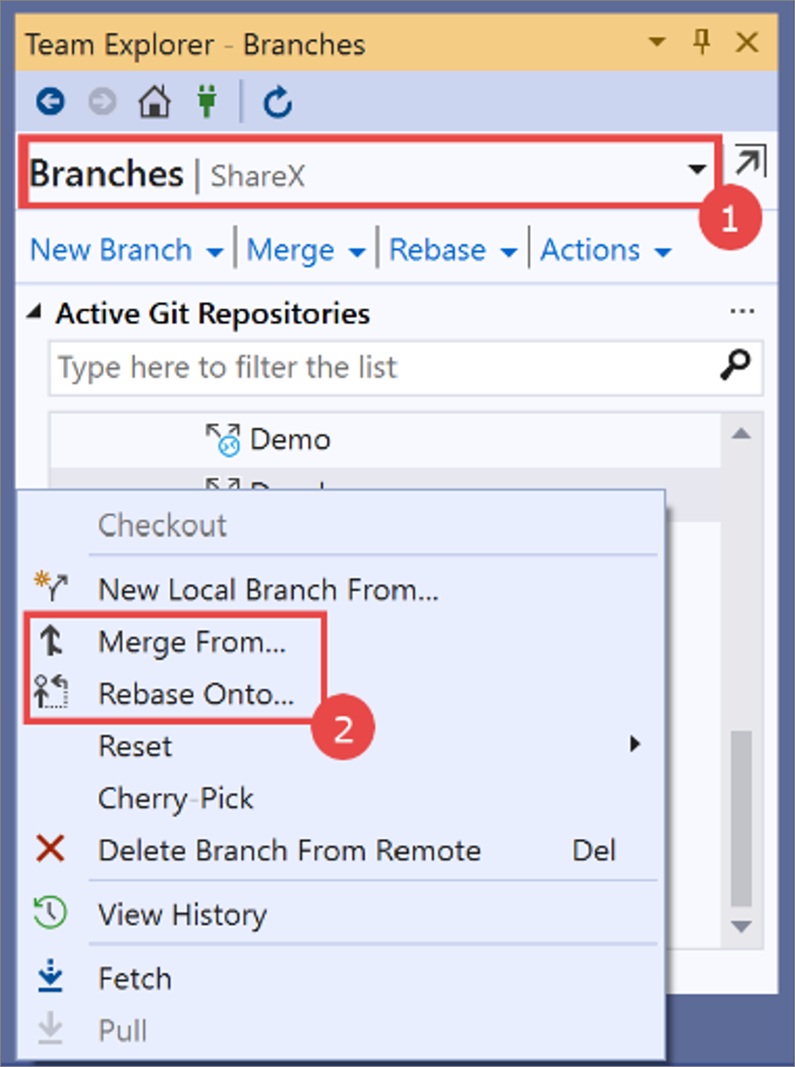 2. Right-click the remote branch and select Merge From or Rebase Onto.
