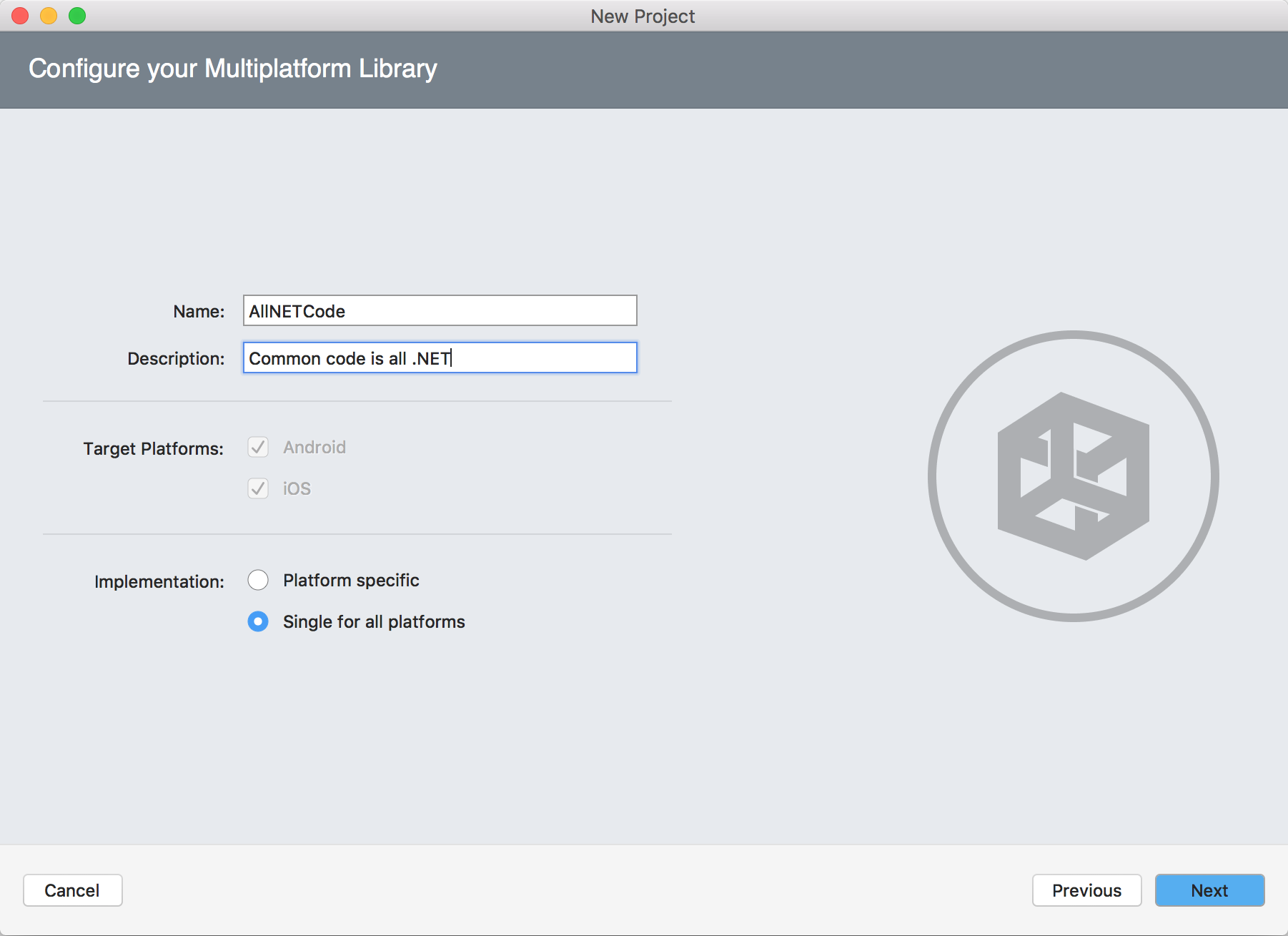 The library can only contain code supported by the selected PCL or .NET Standard profile, as well as any other NuGets that are added. This is suited to business logic and algorithms that can be expressed entirely in the .NET base class library.