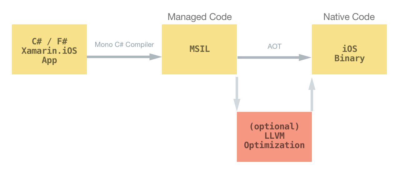 However, there is a security restriction on iOS, set by Apple, which disallows the execution of dynamically generated code on a device. To ensure that we adhere to these safety protocols, Xamarin.iOS instead uses an Ahead of Time (AOT) compiler to compile the managed code. This produces a native iOS binary, optionally optimized with LLVM for devices, that can be deployed on Apple’s ARM-based processor. A rough diagram of how this fits together is illustrated below: