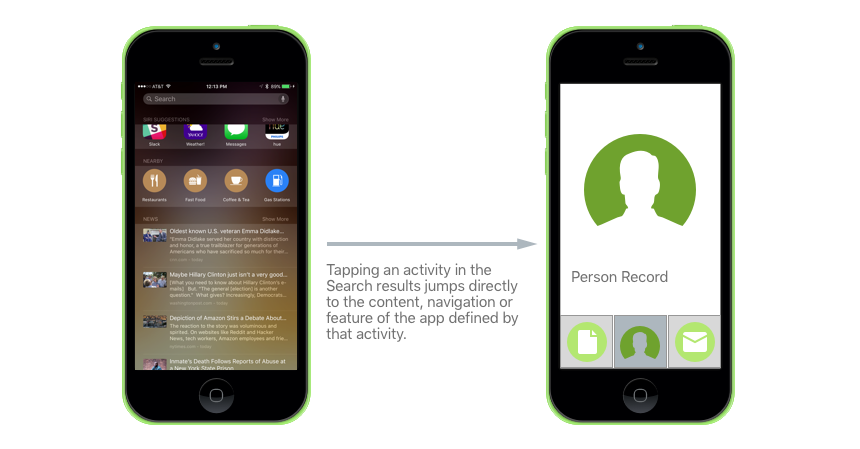 An app exposes this functionality to the system using a collection of technologies such as NSUserActivity, web markup, Core Spotlight, MapKit, Media Player and UIKit.