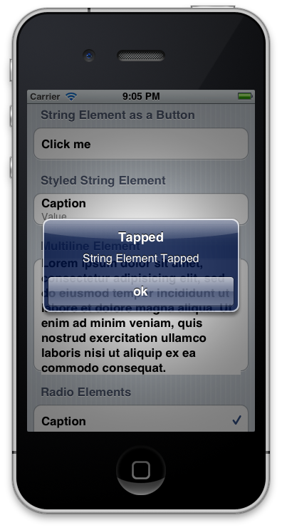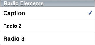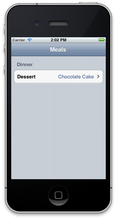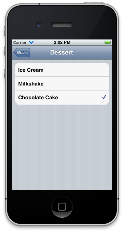 In the above example, when the user taps on "Dessert", MonoTouch.Dialog will create a new page and navigate to it with the root being "Dessert" and having a radio group with three values.