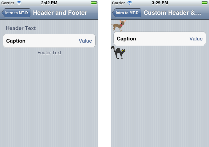 Sections can have headers and footers either as strings, or as UIViews. Typically you will just use the strings, but to create custom UIs you can use any UIView as the header or the footer. You can either use a string to create them like this: