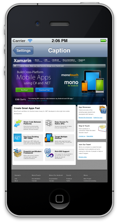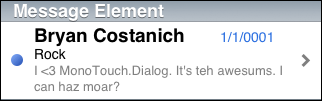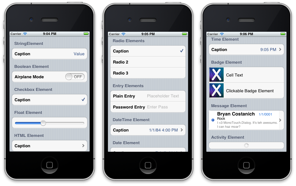 MonoTouch.Dialog, referred to as MT.D for short, is a rapid UI development toolkit that allows developers to build out application screens and navigation using information, rather than the tedium of creating view controllers, tables, etc. As such, it provides a significant simplification of UI development and code reduction. For example, consider the following screenshot: