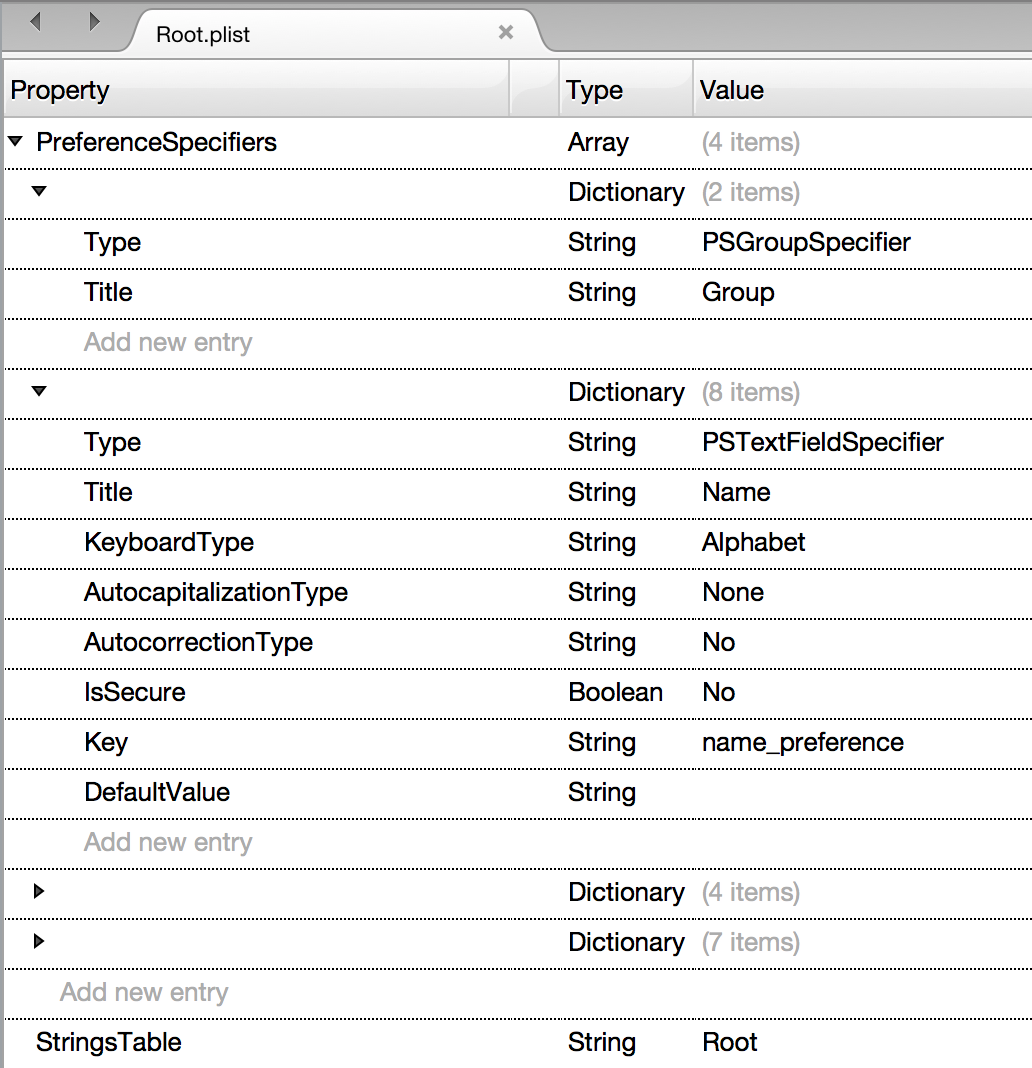 ApplicationGroupContainerIdentifierto the Root.plist with the value set to the app group you've configured, (eg.group.com.xamarin.WatchSettingsin the sample):Edit the Settings-Watch.bundle/Root.plist to contain the options you wish to use - the template file contains a group. textfield, toggle switch and slider by default (which you can delete and replace with your own settings):