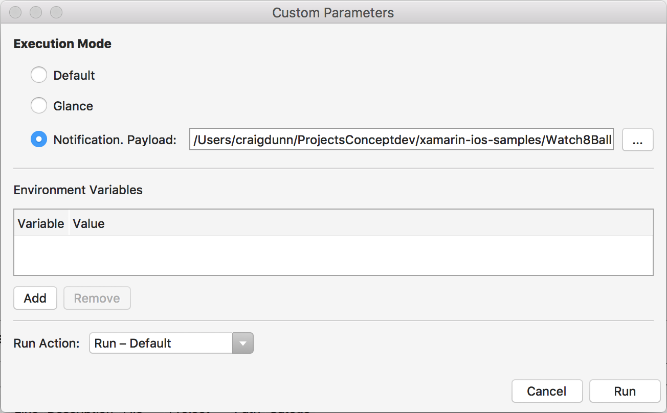 This opens the Custom Parameters window where you can select Notification (and provide a JSON payload), then press Run to start the watch app in the simulator: