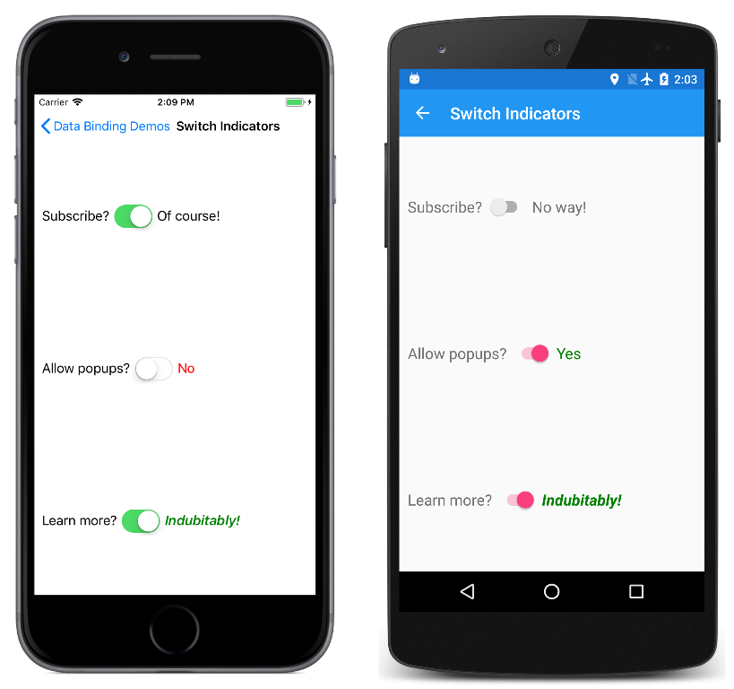 In the last of the three Switch and Label pairs, the generic argument is set to Style, and entire Style objects are provided for the values of TrueObject and FalseObject. These override the implicit style for Label set in the resource dictionary, so the properties in that style are explicitly assigned to the Label. Toggling the Switch causes the corresponding Label to reflect the change: