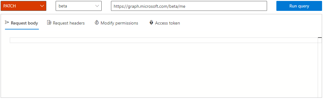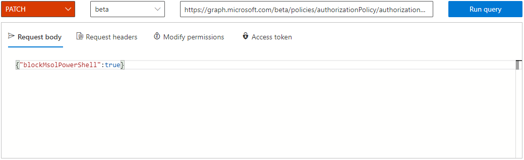 https://graph.microsoft.com/beta/policies/authorizationPolicy/authorizationPolicyIn the Request Body text block, enter the code and select Run query.