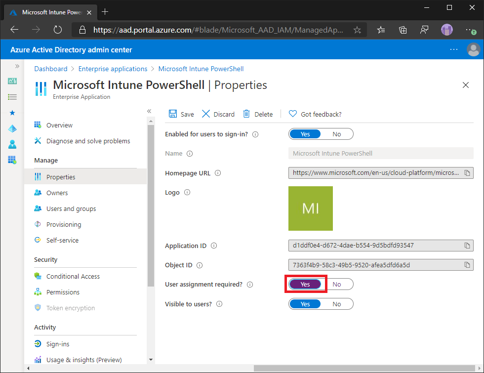 Change User assignment required? to Yes.