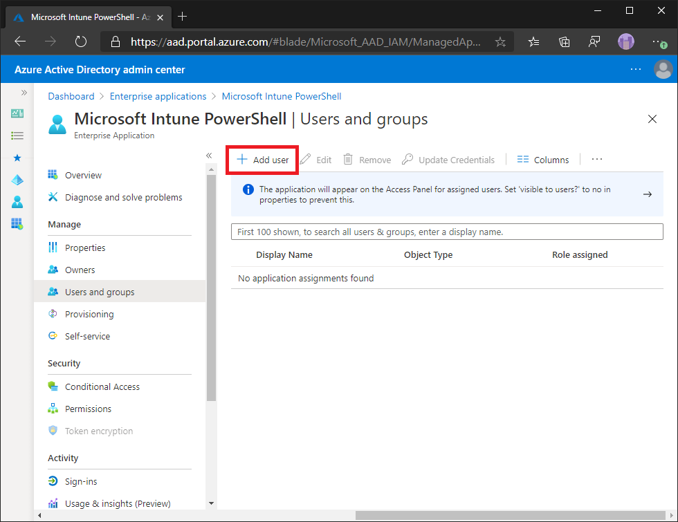 To add or remove users of the Microsoft Intune PowerShell application: