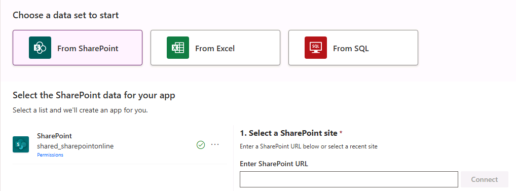 Another way for connecting your app to data is to select Start with data. With this option you can select an existing data source. Such as Excel, SharePoint, Or SQL.