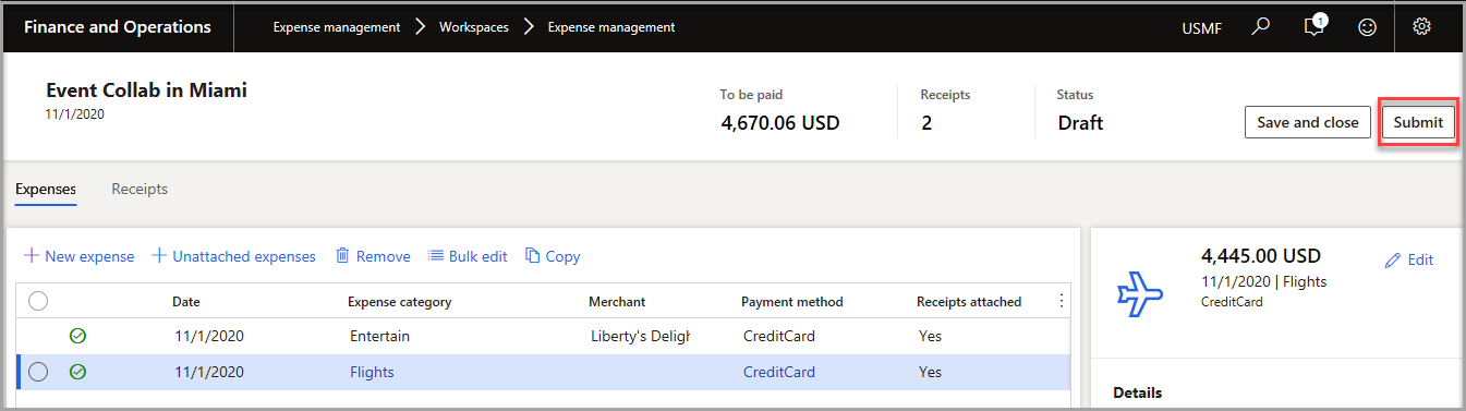 In the upper-right corner of the expense report, select Submit.