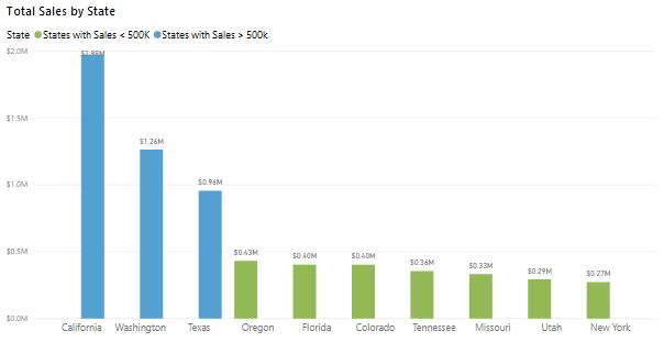 เมื่อสร้างกลุ่ม ให้สังเกตว่าวิชวลอัปเดตโดยพิจารณาจากลุ่มใหม่แล้ว รูปภาพต่อไปนี้แสดงให้เห็นว่ามีการจัดกลุ่มเมืองอื่นๆ ซึ่งเป็นเมืองที่มียอดขายต่ำกว่า (น้อยกว่า 500,000 ดอลลาร์) ไว้ด้วยกัน และไฮไลต์ด้วยสีที่แตกต่างกัน