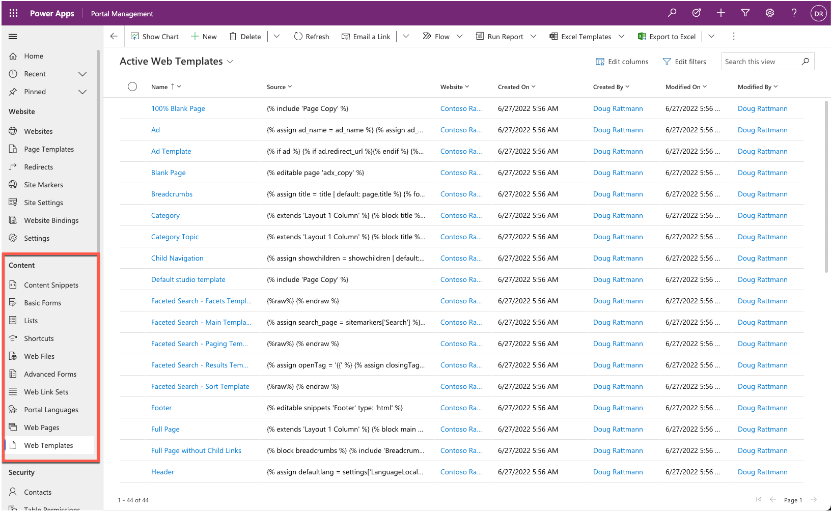 The Content section contains tables that define what and how static and dynamic information is displayed on a Power Pages website. While you can add some content by using Power Pages design studio, you can only add or modify certain aspects by updating the data directly with the Portal Management app.