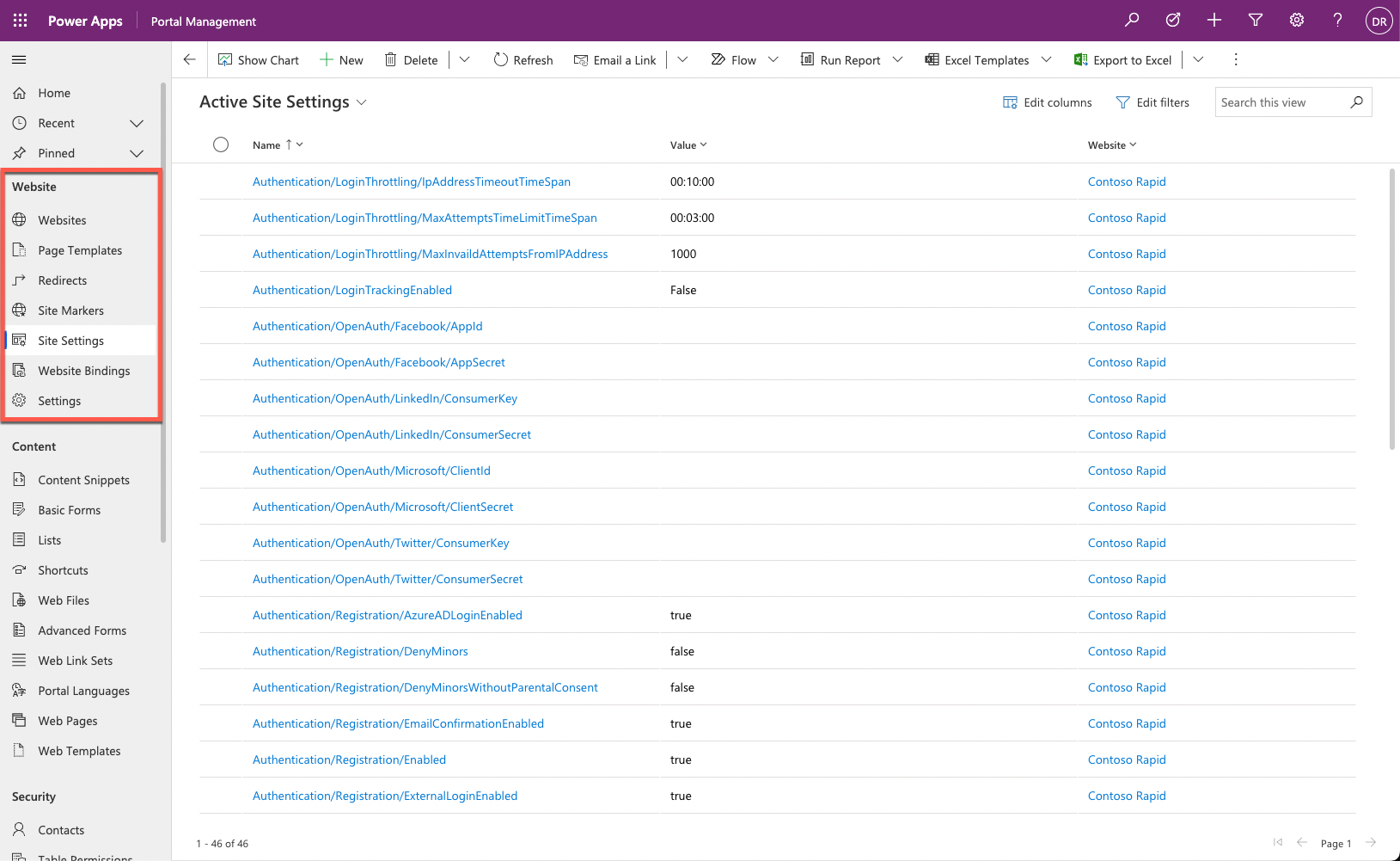 | Site Settings | Site settings define specific behaviors of website functionality and features. Site settings are value pairs that can enable or disable particular items, such as authentication settings, searching, and caching. |