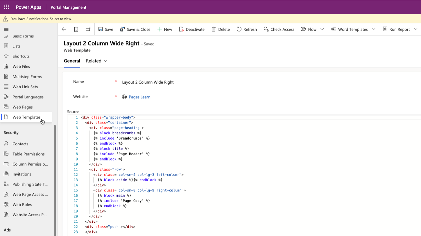 To create custom page templates, you can use the Web Template type, which is a layout template. For example, if a web template includes static HTML, this HTML is rendered as it is in the page output that uses that template. The real power of web templates comes from the ability to contain Liquid code, which adds processing capabilities to the static content, including access to Dataverse data.