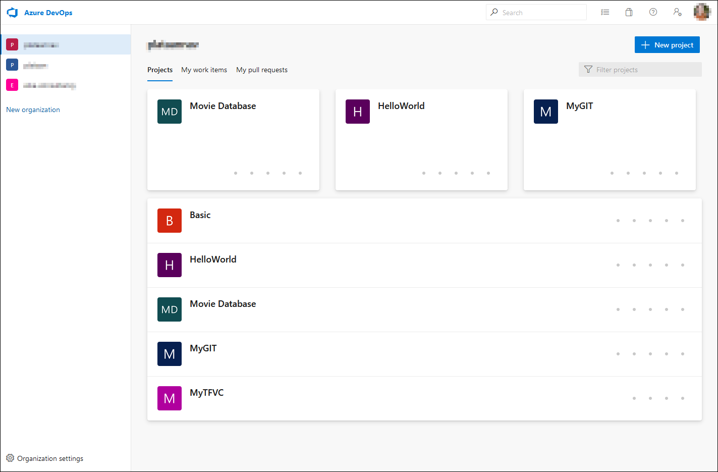Once signed in to Azure DevOps you get an overview of all the organizations you have access to with your account. You can create a new organization using the left menu. In the center of the screen you can find a list of projects that are created within the organizations, with the most recent projects you worked on top of the list.