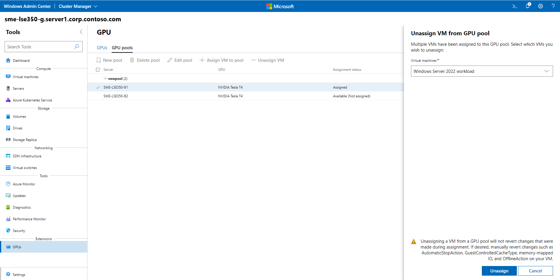 On the Unassign VM from GPU pool page, in the Virtual machines list box, specify the name of the VM, and then select Unassign.