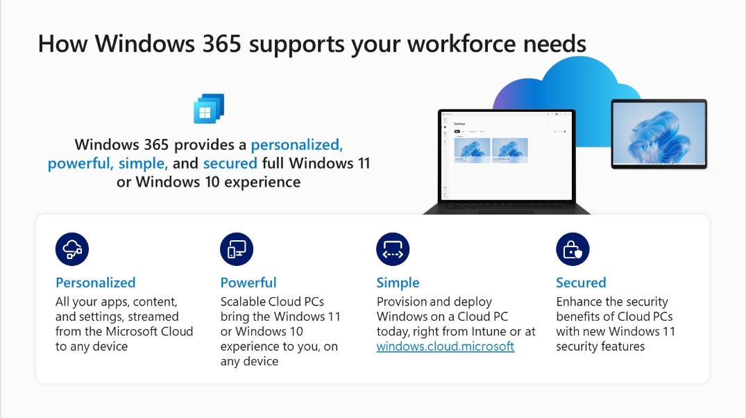 With Windows 365, every user can access a persistent Cloud PC to use the tools they need and to be productive, while IT maintains full oversight of corporate data, applications, and identity security.