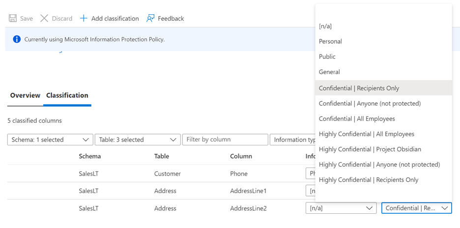 Azure SQL, veri sınıflandırmasında hem SQL Information Protection ilkesi hem de Microsoft Information Protection ilkesi sunar ve gereksinimlerinize göre bu iki ilkeden birini seçebilirsiniz.