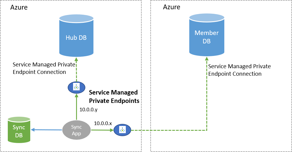 Yeni özel bağlantı özelliği, veri eşitleme işlemi sırasında eşitleme hizmetiyle üye/hub veritabanlarınız arasında güvenli bir bağlantı kurmak için hizmet tarafından yönetilen bir özel uç nokta seçmenize olanak tanır. Hizmet tarafından yönetilen bir özel uç nokta, belirli bir sanal ağ veya alt ağ içinde yer alan özel IP adresidir. Data Sync içinde, hizmet tarafından yönetilen özel uç nokta Microsoft tarafından oluşturulur ve veri eşitleme hizmeti tarafından belirli bir eşitleme işlemi için özel olarak kullanılır.