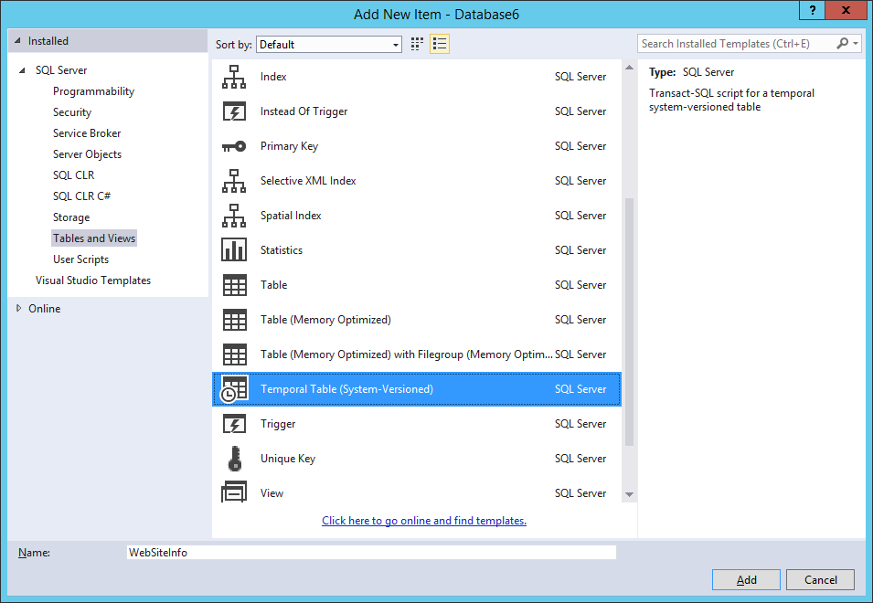 SSDT'de, veritabanı projesine yeni öğeler eklerken "Geçici Tablo (Sistem Sürümü Oluşturulmuş)" şablonunu seçin. Bu, tablo tasarımcısını açar ve tablo düzenini kolayca belirtmenizi sağlar: