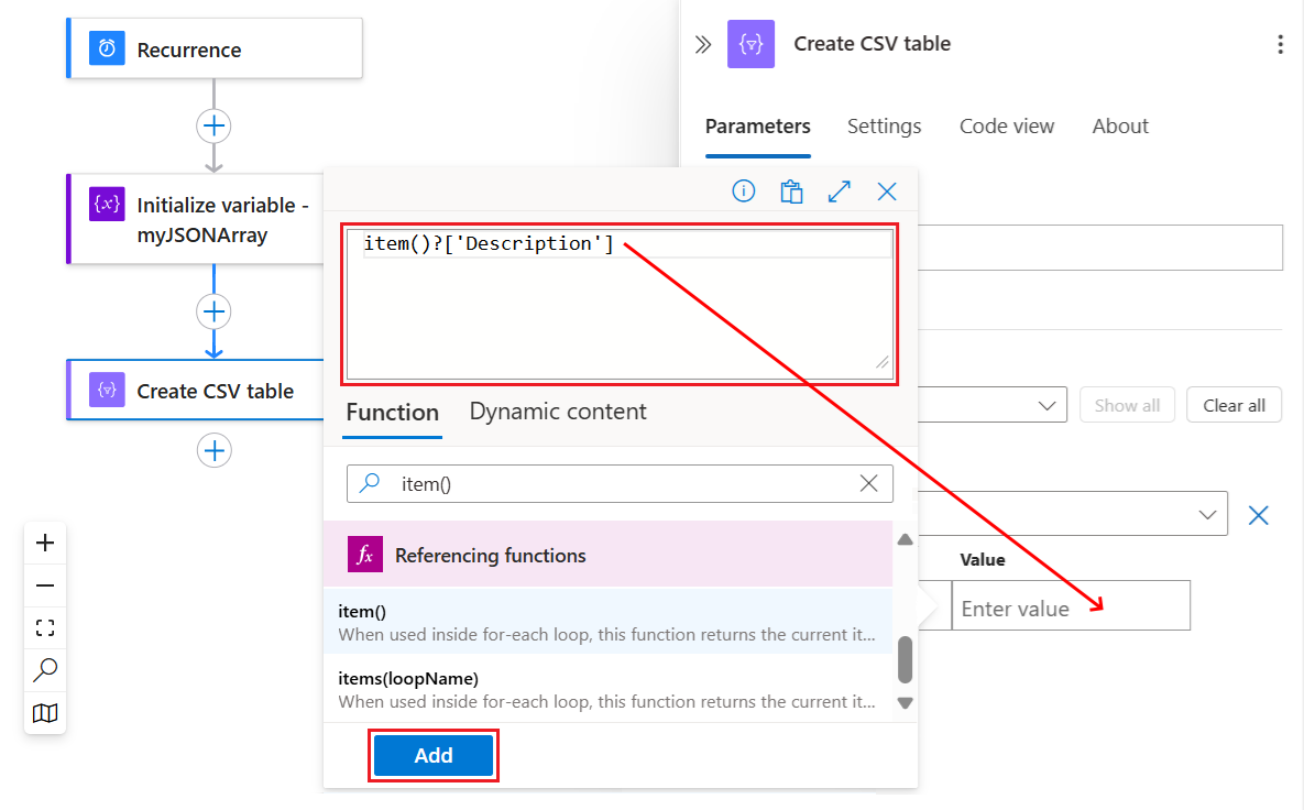 - Değer:[ { "Description": "Apples", "Product_ID": 1 }, { "Description": "Oranges", "Product_ID": 2 }]CSV tablosu oluştur adlı Veri İşlemleri eylemini eklemek için bu genel adımları izleyin.