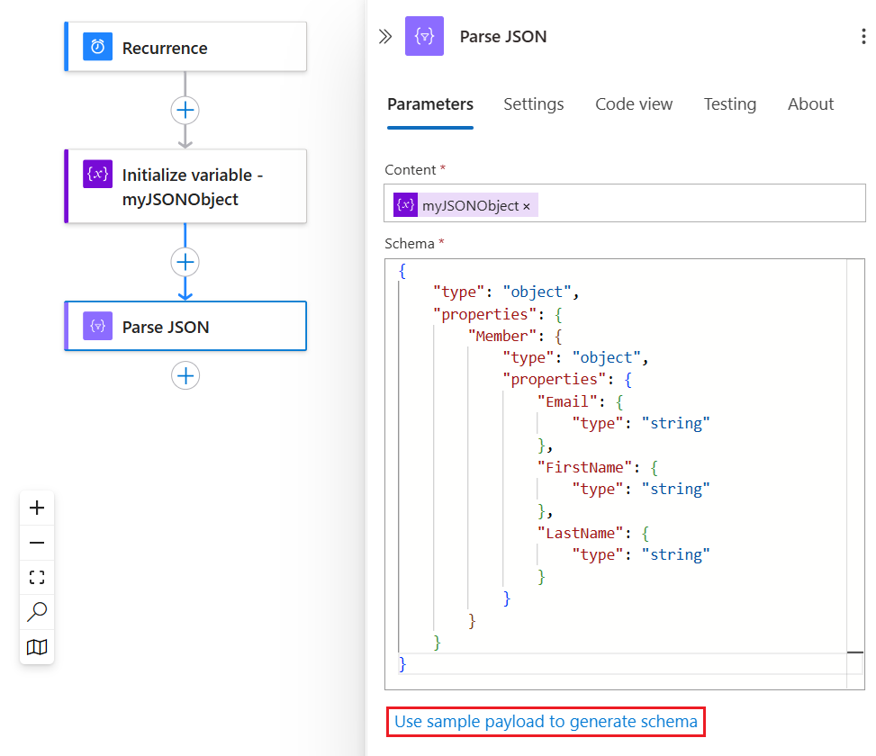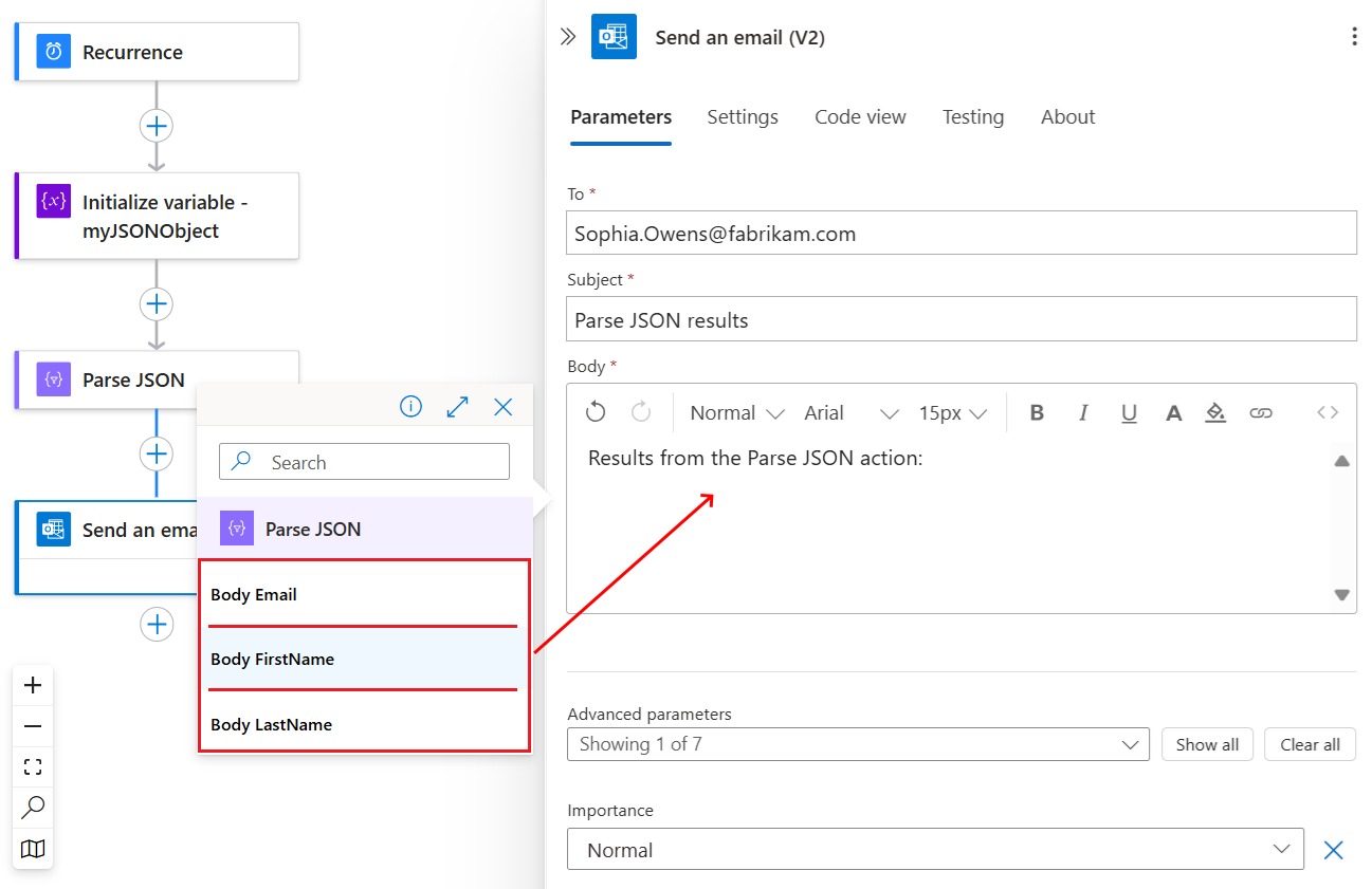 { "Member": { "Email": "Sophia.Owen@fabrikam.com", "FirstName": "Sophia", "LastName": "Owen" } }JSON Ayrıştır adlı Veri İşlemleri eylemini bulmak için bu genel adımları izleyin.
