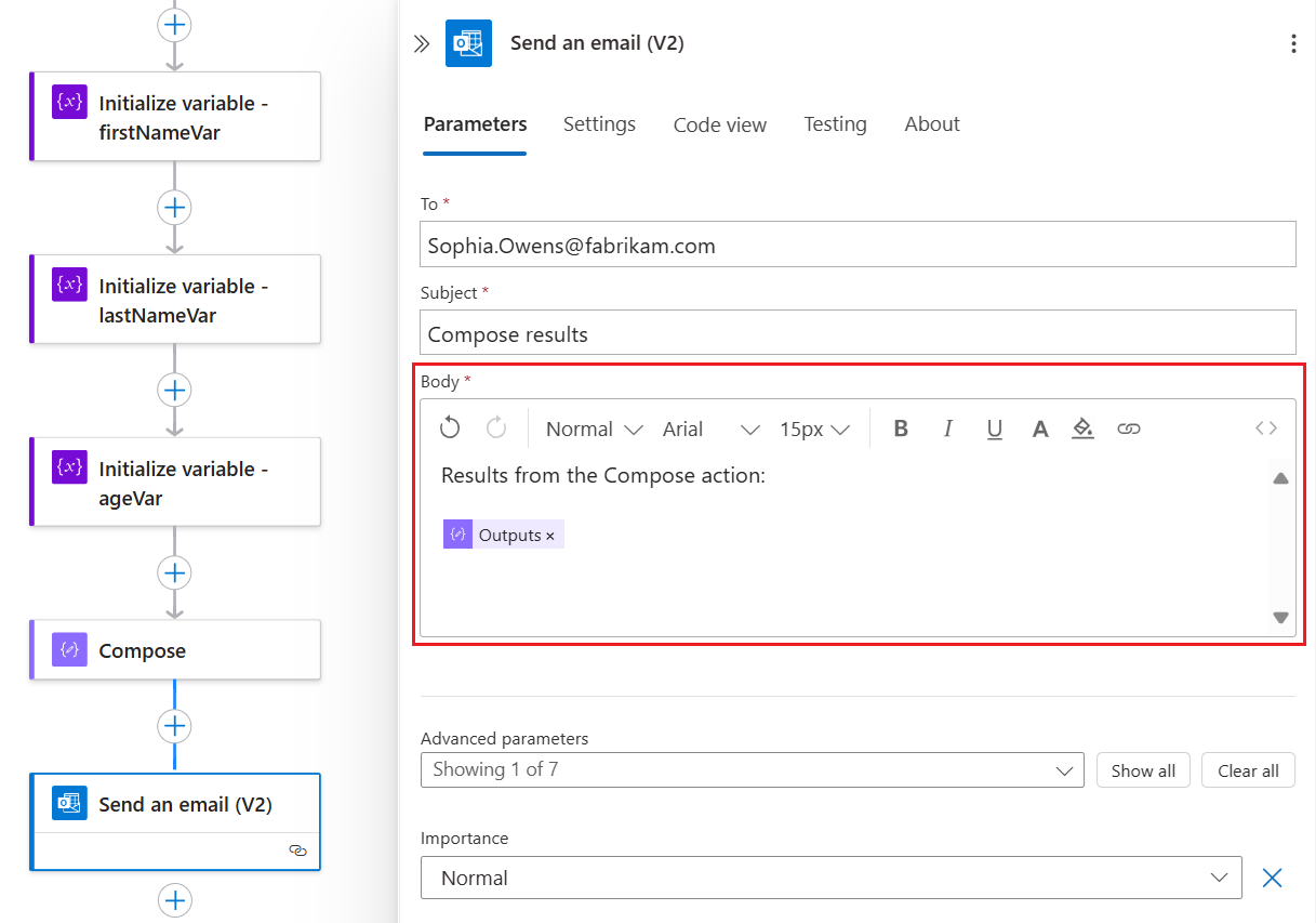 Bu örnekte, sonuç e-posta gövdesinde görünür, bu nedenle Çıkışlar alanını Gövde kutusuna eklersiniz: