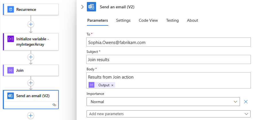 Tasarımcıda, henüz seçili değilse Katıl eylemini seçin. Gönderen kutusuna, bir dize olarak birleştirmek istediğiniz öğeleri içeren diziyi girin.