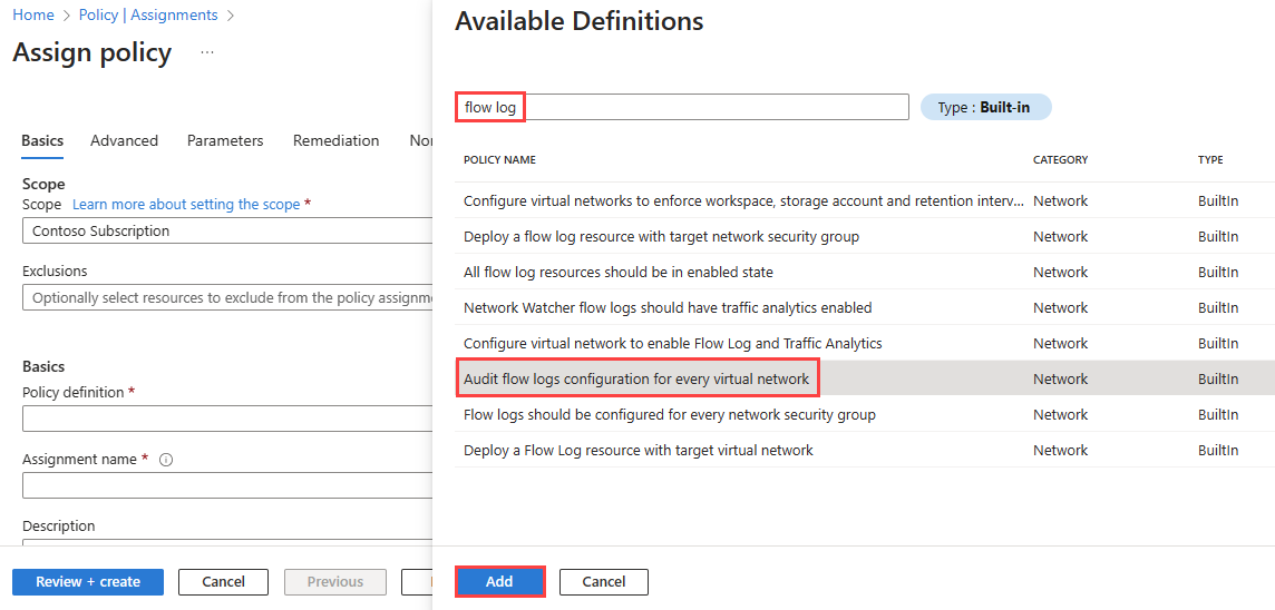 Atamak istediğiniz yerleşik ilkeyi seçmek için İlke tanımının yanındaki üç noktayı (...) seçin. Arama kutusuna akış günlüğü yazın ve yerleşik filtreyi seçin. Arama sonuçlarından Her sanal ağ için akış günlükleri yapılandırmasını denetle'yi seçin ve ardından Ekle'yi seçin.