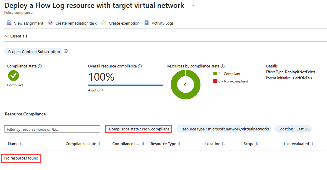 Her sanal ağ için Denetim akışı günlükleri yapılandırması ilkesi, sanal ağın akış günlüğü özelliği yoluyla bağlı akış günlüklerini kontrol etmek için türündeki tüm Azure Resource Manager nesnelerini denetleyerek belirli bir kapsamdaki mevcut tüm sanal ağları denetler. Ardından akış günlük kaydı etkin olmayan tüm sanal ağları işaretler.