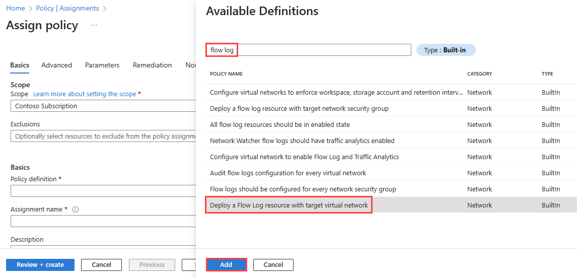 Atamak istediğiniz yerleşik ilkeyi seçmek için İlke tanımının yanındaki üç noktayı (...) seçin. Arama kutusuna akış günlüğü yazın ve yerleşik filtreyi seçin. Arama sonuçlarından Hedef sanal ağ ile bir akış günlüğü kaynağı dağıt'ı seçin ve Ekle'yi tıklayın.