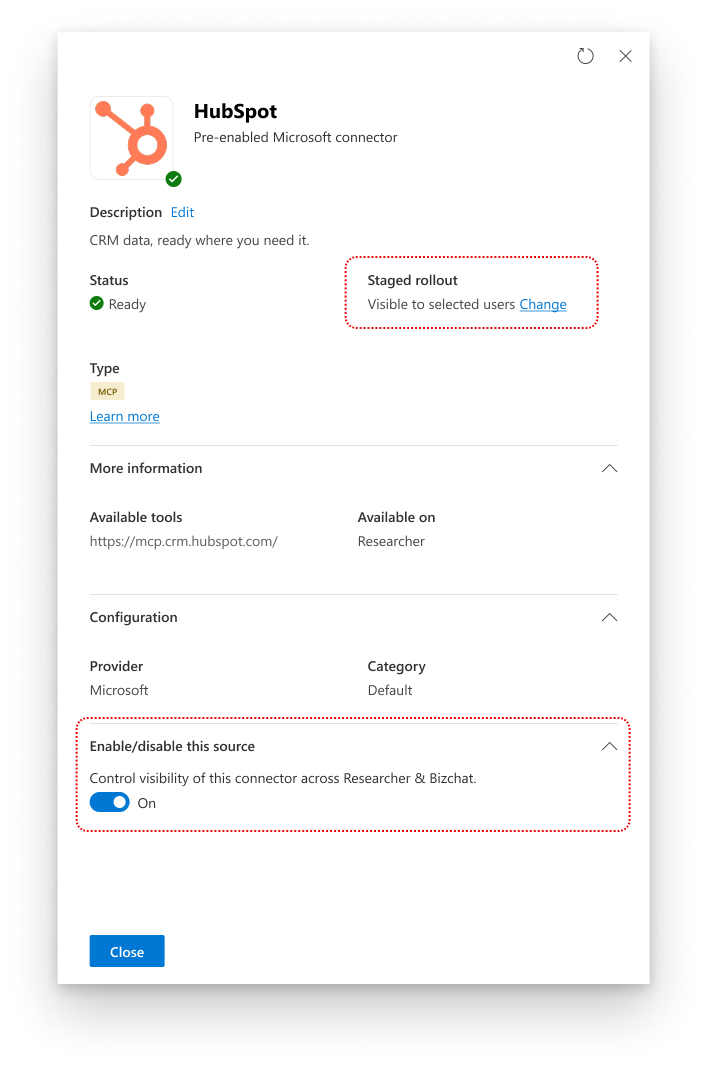 - Users can disable the knowledge source in Researcher at any time by turning off the toggle for the source in Researcher.