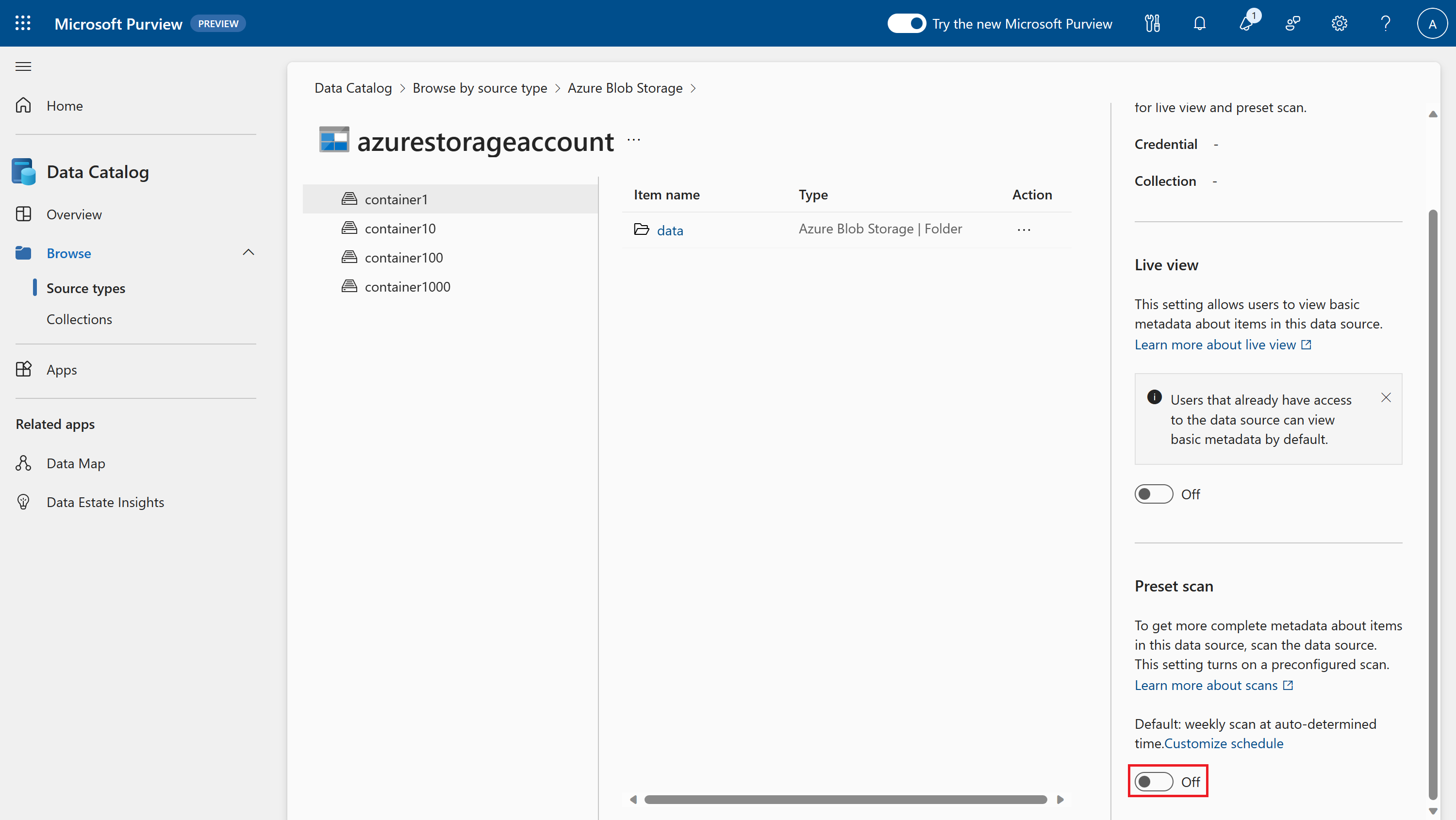 Assets with a live view allow data source administrators to perform preset scans. A live view asset has only some of it's metadata automatically available to users. A preset scan gathers the rest of that metadata and makes it available in Microsoft Purview.