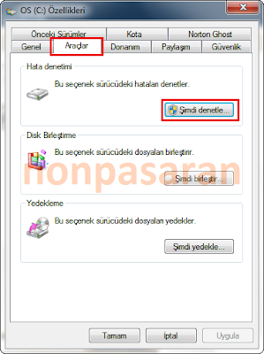 2- "Araçlar" sekmesinden Hata denetimindeki "Şimdi denetle"ye tıklayın.