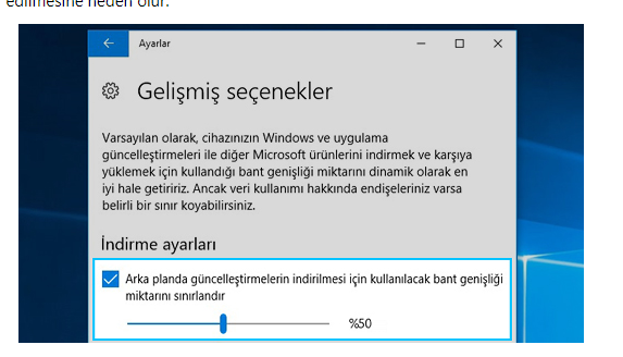 Arka planda güncelleştirmelerin indirilmesi için kullanılacak bant genişliği miktarını sınırlandır'ı seçin. Ardından, arka plandaki indirmeler için kullanılabilir bant genişliğinin yüzdesini ayarlamak için kaydırıcıyı kullanın. Düşük değerler daha az bant genişliği kullanır, ancak güncelleştirmelerin daha yavaş teslim edilmesine neden olur.