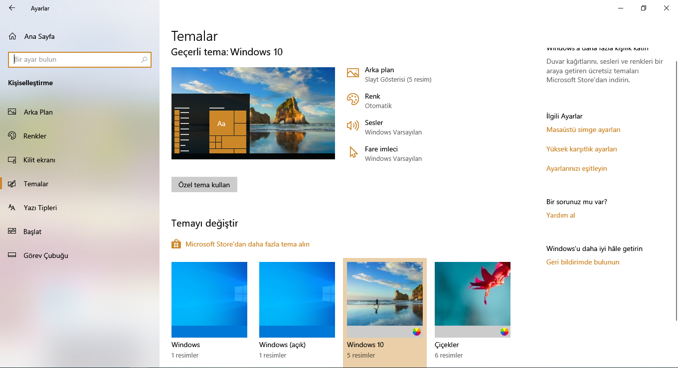 Ayarlar>Kişisel>Temalar kısmının ekran görüntüsünü iletmenizi rica ederim.