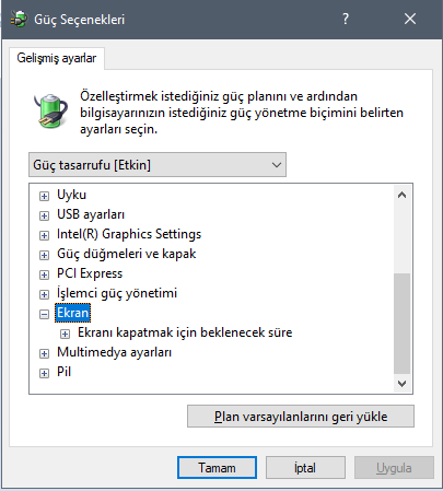 Bir çok yol denedim. Ekran kartı sürücülerini kaldırdım. İnternetteki bir çok yöntemi denedim. Bazıları güç ayarlarında ekran sekmesinde bulunan ayarlardan bahsetmişler ama bende yok. Bütün güç planlarına baktım ama yok.