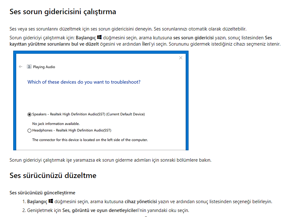 Ek olarak Ses sorunlarını düzeltme makalesindeki adımları uygulayınız. Sorun gidericiyi çalıştırınız ve ses sürücüsünü kaldırıp tekrar yükleyiniz.