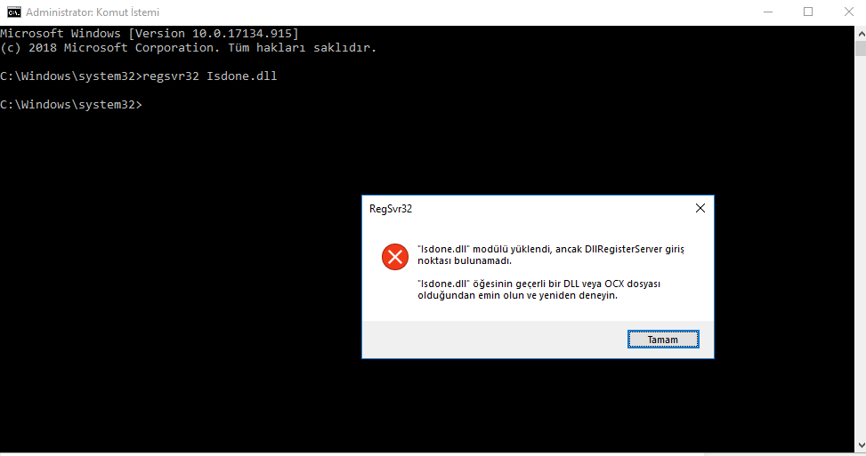 regsvr32 Isdone.dll yazınız ve Enter'a basınız.