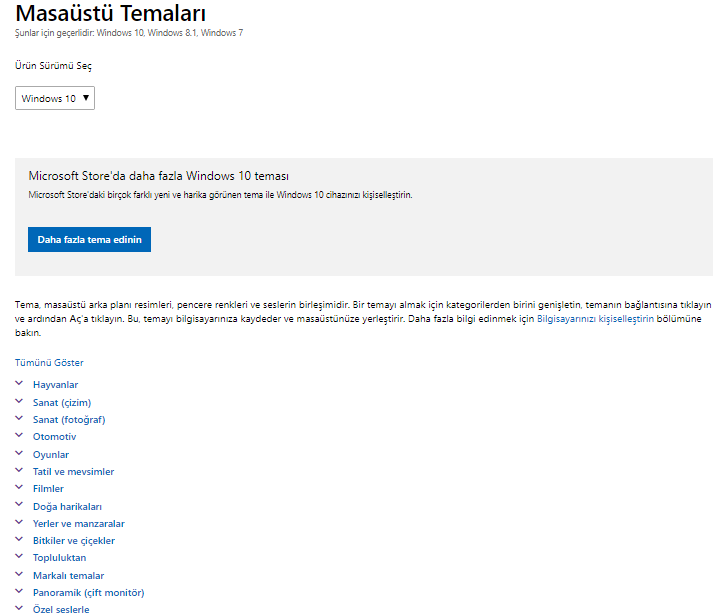 Windows Mağazasından indirilen temalar, Kişiselleştirme ayarlarındaki Temalar seçimine otomatik olarak aktarılmaktadır. Başlat Menüsü'nden Ayarlar'a tıklayınız ve ardından Kişiselleştirme > Temalar'a giderek Mağaza'dan yüklediğiniz