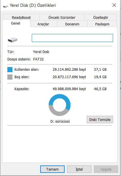 Bu disk FAT32 olarak biçimlendirilir, güvenlik sekmesi yalnızca NTFS olarak biçimlendirilmiş disklerde görünür