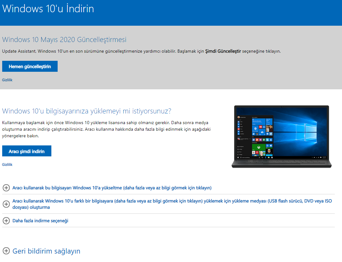 İndirme ve Windows 10 yükleme ortamı oluşturma konusunda bu bağlantıdaki sayfaya başvurabilirsiniz.