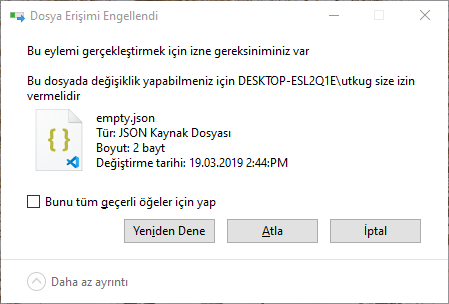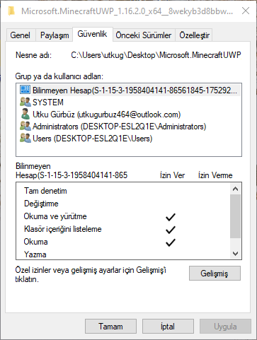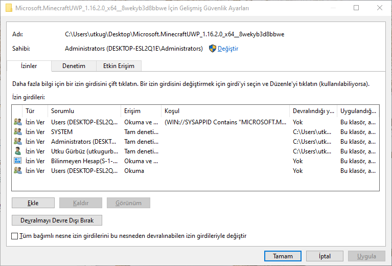 Gözde Hanım ben zaten sahipliğini aldım oradaki Minecraft klasörünü ben mağazadan indirerek yapmadım internette appx file maker isimli bir dosya ile yaptım ve 2 tane Minecraft klasörü oldu hem mağazadan inen hem de o klasör oluştu ben o klasörün içindeki bütün dosyaların sahipliğini teker teker aldım ancak yine de kendi kendimden izin almam gerektiğini söylüyor ben zaten bilgisayarı sıfırlayacağım o yüzden yanıtınız için teşekkürler