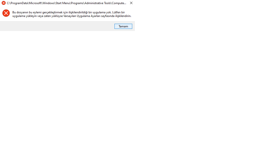 "Bu dosya eylemi gerçekleştirme için ilişkilendirilmiş bir programa sahip değil. Lütfen bir program yükleyin veya zaten yüklü program varsa, Varsayılan programlar denetim masasında bu programla ilişkilendirin hatası ile