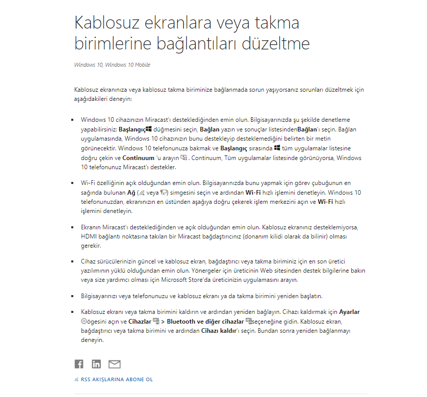 Televizyonunuzda Miracast özelliğini kullanarak bağlantı kurmaya çalıştığınızda karşılaşmakta olduğunuz sorunla ilgili olarak; Miracast ile kablosuz bir ekrana yansıtma makalesinde sağlanan hazırlık aşamalarını ve yönergeleri takip ederek durumu bir kez daha kontrol ederek sonucu bize iletmenizi rica ederim.