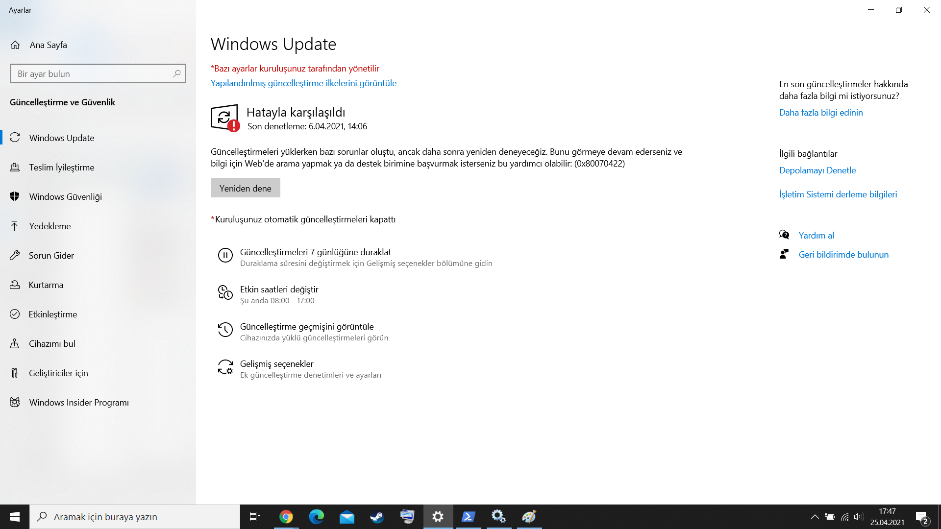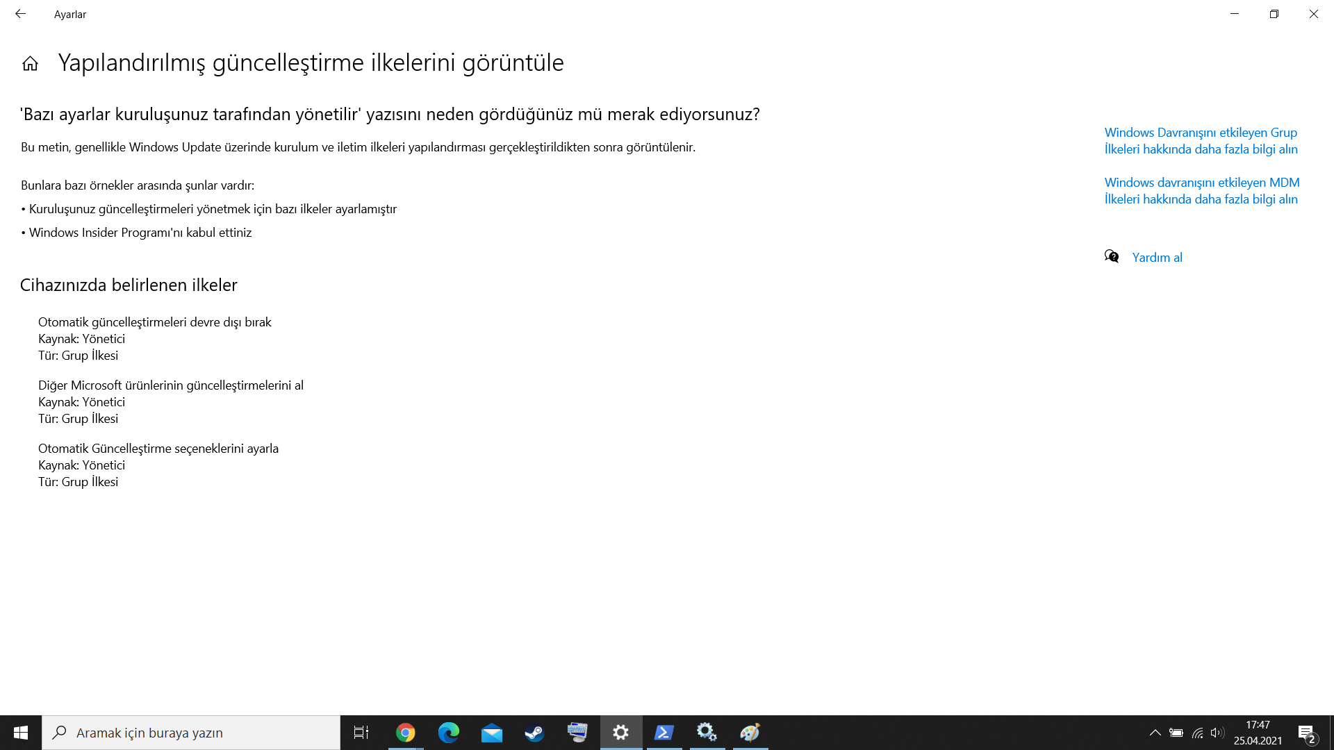 Yakın zamanda bilgisayarınızda bir okul veya iş hesabında oturum açmış mısınız? Bu, kuruluş ayarlara erişimi kısıtlamak için ilkeler ayarlamışsa genellikle bu soruna neden olabilir.